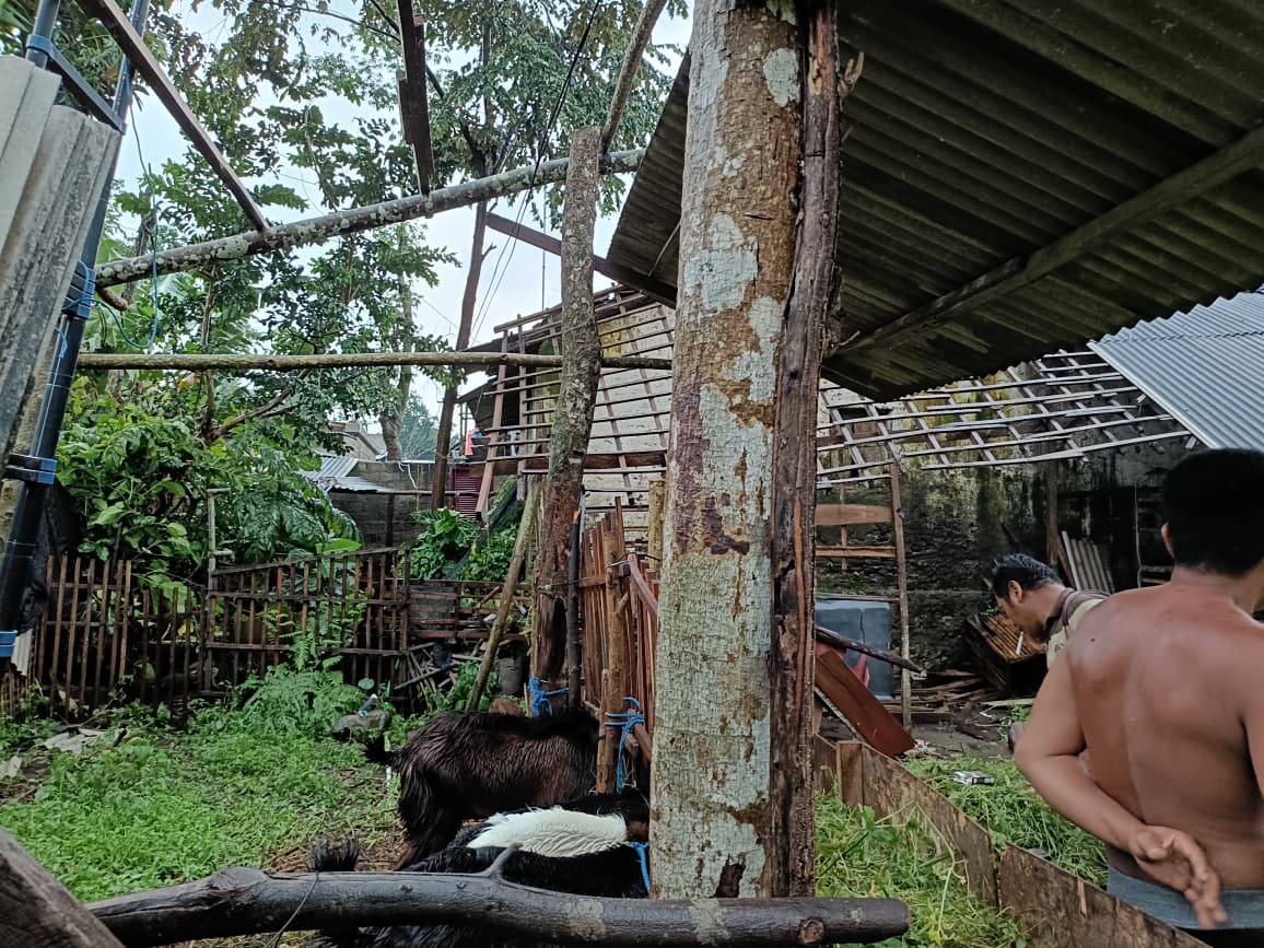 “Setelah mendapat laporan, kami segera bergerak bersama anggota ke lokasi. Hujan deras dan angin kencang ini mengakibatkan tiga rumah warga rusak, beruntung tidak banyak pohon tinggi di sekitar sini,” ungkapnya.