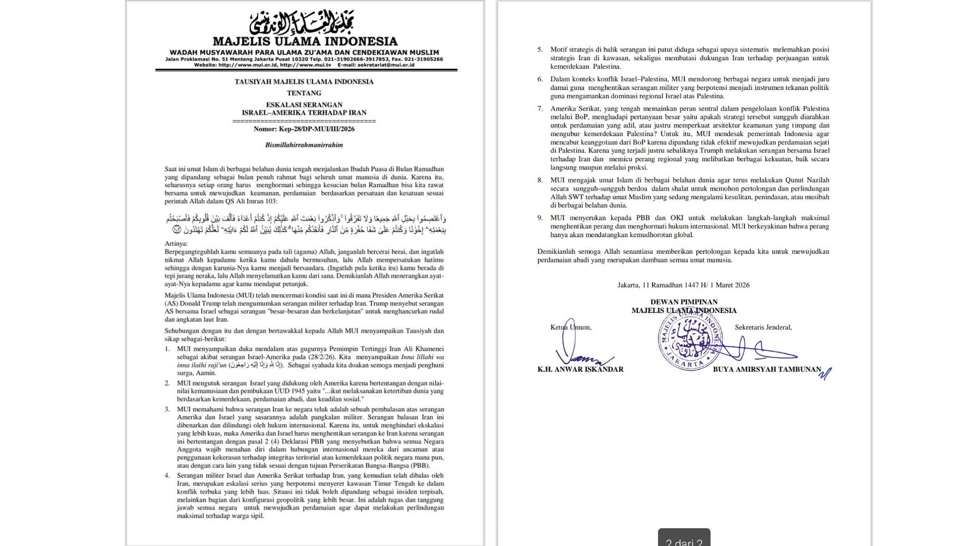“MUI mengutuk serangan Israel yang didukung Amerika karena bertentangan dengan Pembukaan UUD 1945 yang mengamanatkan ketertiban dunia berdasarkan kemerdekaan, perdamaian abadi, dan keadilan sosial,” tulis dokumen yang ditandatangani Ketua Umum MUI, K.H. Anwar Iskandar, dan Sekretaris Jenderal, Buya Amirsyah Tambunan.