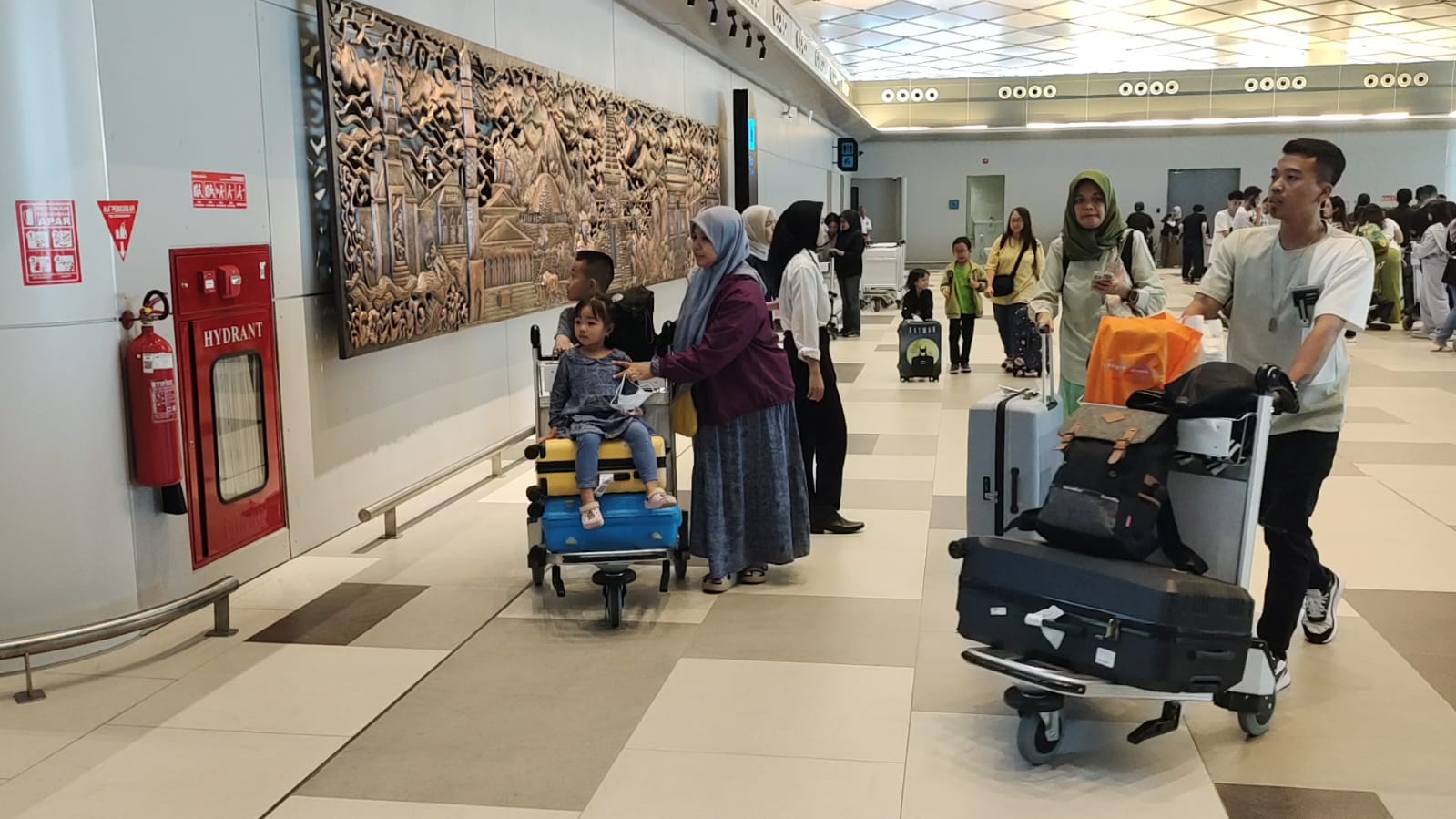 Di area aula keberangkatan, relief besar yang menghiasi dinding terminal menjadi latar belakang favorit para pemudik untuk mengabadikan momen kepulangan mereka ke kampung halaman.